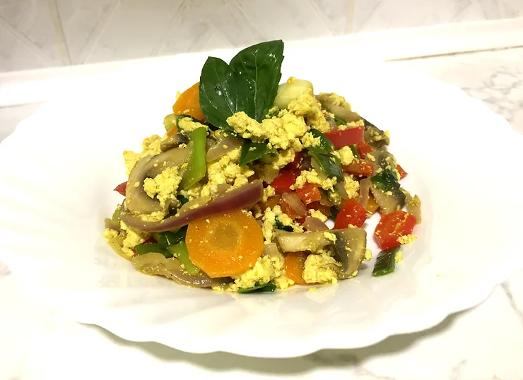 Tofu sir ocedite i viljuškom izgnječite tako da liči na kajganu. Povrće iseckajte i na malo ulja kratko propržite dok ne omekša ali ipak zadrži blagu hrskavost. Dodajte izdrobljeni tofu sir, promešajte i propržite još par minuta. U medjuvremenu, sve začine sjedinite, dodajte par kašika vode toliko da dobijete sos (ako sosu dodate malo više vode, ne previše, kajgana će biti sočnija – uradite po svom ukusu). Prelijte sos preko povrća i tofua, promešajte i pržite još par minuta. Poslužite uz svež hleb, zemičke ili tortilje.